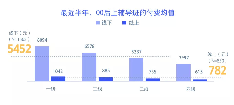 从付费均值来看,最近半年,一、二线市场线下培训费用平均高达7336元,线上则为967元。三、四线城市线下培训费用平均为4664元,线上675元。线下费用由于地租等成本,一、二线城市远高于三、四线,但从线上来看,差距并不大。