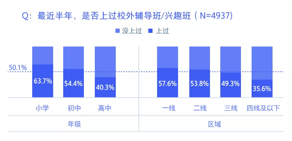 在“最近半年,是否上过校外辅导班/兴趣班”的问题中,各年级50.1%的00后表示上过辅导班/兴趣班,一、二线上过的比重高于平均比重,而三四线及以下城市上辅导班/兴趣班的比例低于平均水平,四线及以下城市上过辅导班/兴趣班的比重仅为35.6%,低于一线城市12个百分点。