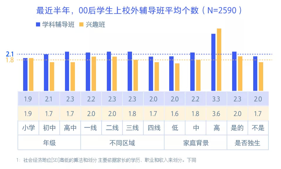 报告显示,近半年内,88.7%的00后上过学科辅导班,平均为2.1个小时;47.2%的00后上过兴趣班,平均为1.8个小时,时间差距不足半个小时。