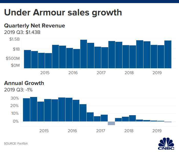 11月4日美股盘前,这家美国运动品牌公布2019财年第三季度业绩。截至9月底的三个月内,全球营收同比下滑1%至14.3亿美元,超出14.1亿美元的分析师平均预期。