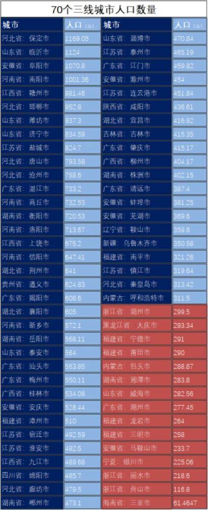 虽然只是个段子,但也从侧面说明了我们不能只盯着利空三四线的消息看,还需要深入分析了解三四线。其实70个三线城市,一般多为东部经济较发达的地级市、中部地区的省域副中心城市,以及西部地区的部分省会城市。我做了份三线城市人口数据统计表,真是不统计不知道,一统计吓一跳: