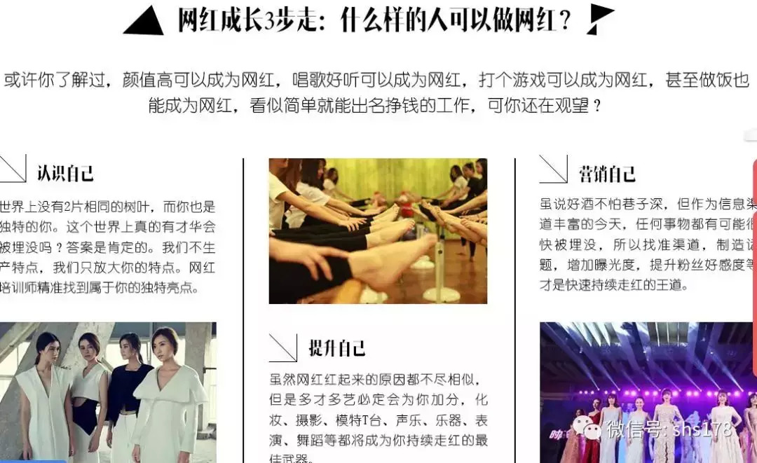 而其中如何成为网红,也规划了章程:认识自己、提升自己、营销自己。也放了一张课程资料贴图,但是看标题和前面看到的几家培训机构中的也没有太大差异。