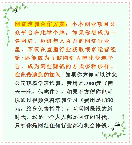 虽然一目了然,但新文化商业(Ent-Biz)还是一字一字的读了这份网红培训合作方案。划出重点,按照培训费用不同,培训方式有两种:3980元,去公司现场培训,两天一晚,包吃住;1380元,视频资料培训,终身免费指导。