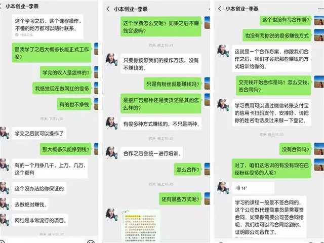 而对方对于这些问题打起太极来:学完以后就可以上岗操作;一个月挣几千到几万都有,绝对挣钱;且包教包会,日后不会随时联系;看别人成功与否没用,只能自己用心学习......就是不提怎么挣钱?不成功怎么办等实质问题。
