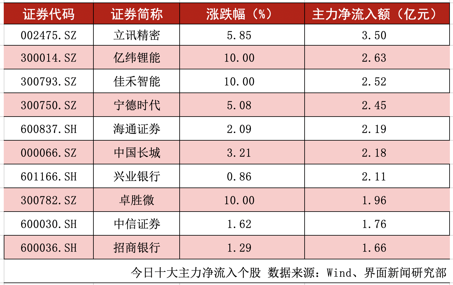 剔除尚未开板的新股及科创板股票,全天沪深两市主力净流入额超过1亿元的个股数量为20个。立讯精密(002475.SZ)、亿纬锂能(300014.SZ)、佳禾智能(300793.SZ)的主力净流入额位居前三,分别为3.50亿元、2.63亿元、2.52亿元。