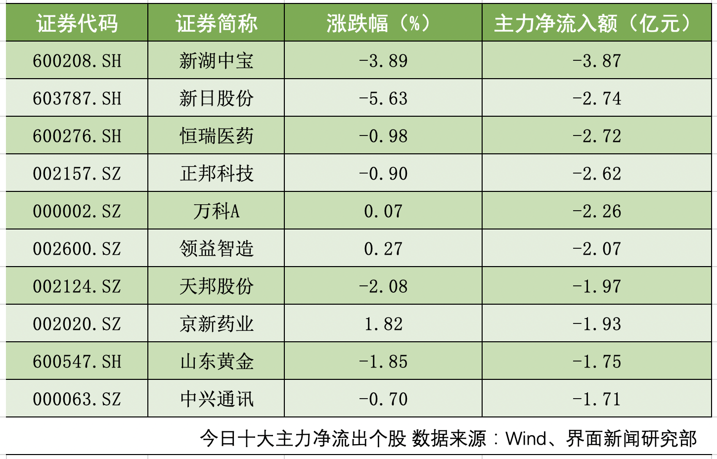 沪深两市共计24只个股主力净流出额超1亿元。新湖中宝(600208.SH)、新日股份(603787.SH)、恒瑞医药(600276.SH)主力净流出额位居前三,分别为3.87亿元、2.74亿元、2.72亿元。