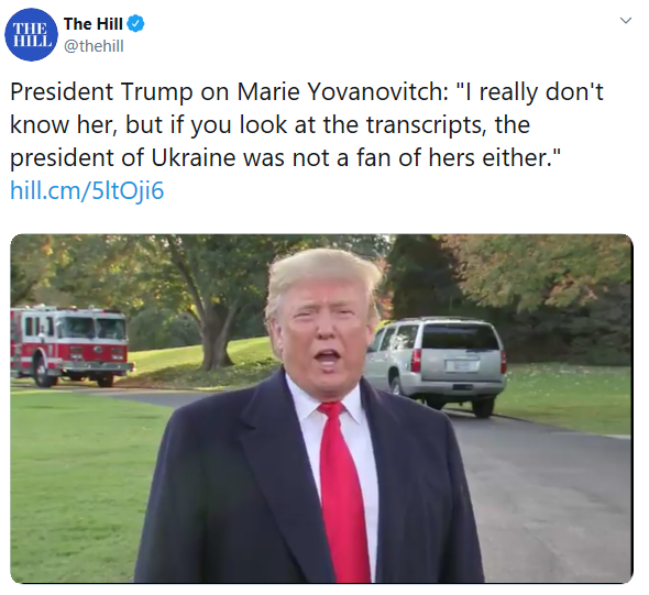 11月4日,特朗普在白宫与记者交流此事时表示,“我真的不了解她,但如果你看一下通话记录就会知道,乌克兰总统也不怎么喜欢她。”