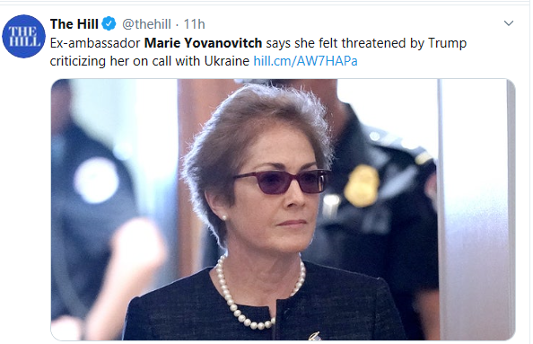 证词显示,约万诺维奇并不清楚特朗普到底是什么意思。但她到今天都对特朗普的评价感到深深的担忧。在被国会议员问到是否感到来自特朗普的威胁时,约万诺维奇回答说:“是的。”