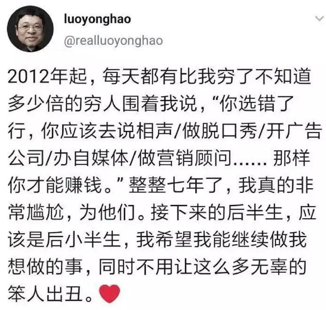 不得不说,老罗的运气实在是差了一点。他总是纵身一跃,跳上风口,然后见证风口的死亡。下一次,他会带着怎样以偏执狂精神制造出的产品重返哪个领域,不禁让人期待。对于让他转行当相声演员、段子手的劝告,老罗以他一贯的调侃语气回答:“我真的非常尴尬,为他们。接下来的后小半生,我希望我能继续做我想做的事,同时不用让这么多无辜的笨人出丑”。成王败寇的故事容易讲述,但罗永浩不会轻易地Go die。