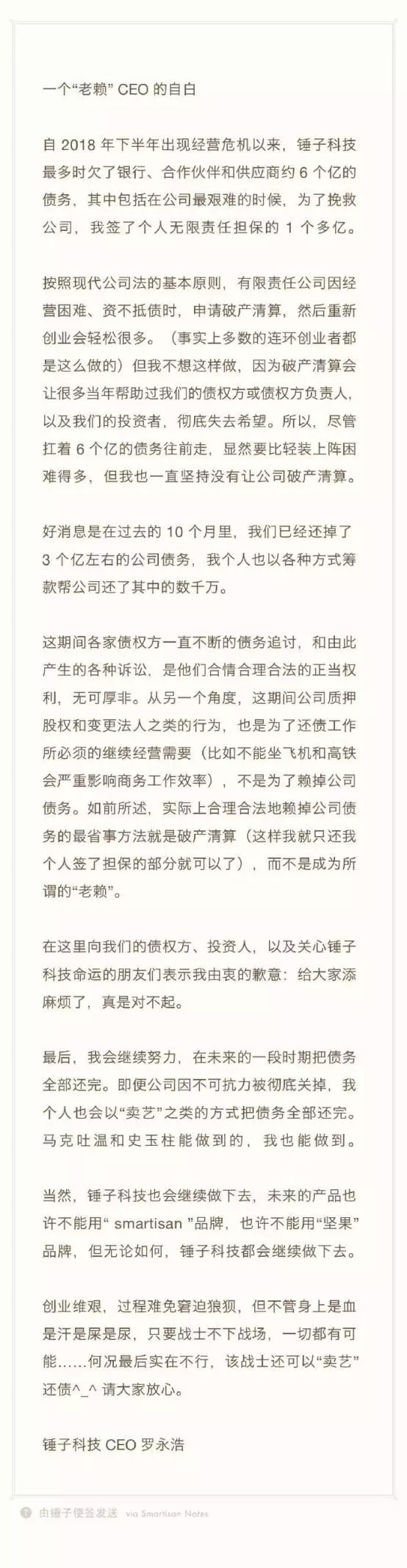 11月3日,据丹阳市人民法院限制消费令,因拖欠370万货款,北京锤子数码科技有限公司及罗永浩被限制消费。当日,罗永浩在自己的微博上作出了名为《一个“老赖”CEO的自白》的回应。今年巴菲特午餐竞得者孙宇晨,笑果文化联合创始人兼CEO贺晓曦纷纷向他抛来“卖艺”橄榄枝。老罗回应称:“感谢币圈的朋友们看得起我,但发币我自己也会,只是没打算做。”