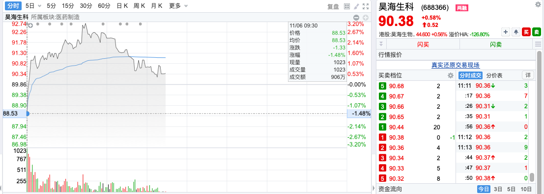 11月6日早盘,科创板上市公司昊海生科(688366)在经过盘前定价阶段多空争夺后,开盘价定在了88.53元/股,跌破89.23元/股的发行价。虽然仅仅5分钟后公司股价即在正式交易阶段回涨至90元/股,但昊海生科依然成为科创板市场首家破发个股。