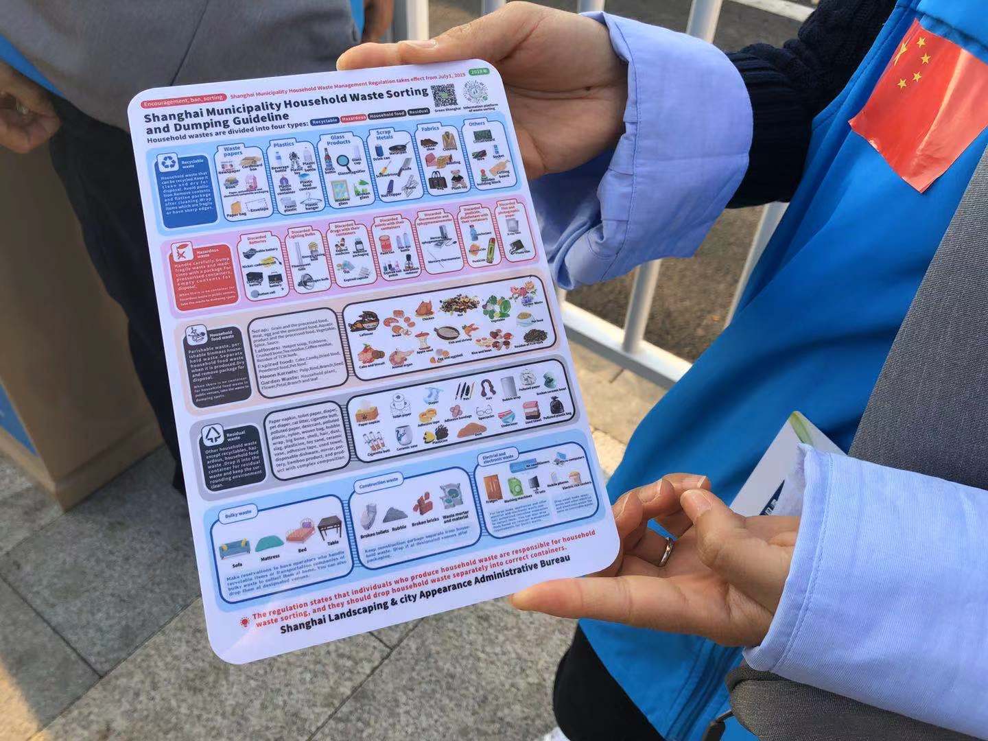 进博会是世界与中国加深交流、扩大贸易的平台,来到“四叶草”的外国嘉宾自然不在少数,为了让世界各地的人都了解上海的垃圾分类,志愿者们每个人手中都有一份英语垃圾分类指示牌。志愿者王阿姨说,“我们年级大了,没有办法讲英文,这个指示牌可以让外国人直观地了解垃圾到底该扔进哪个垃圾桶。外国嘉宾们也非常友好,看完指示牌后,都能正确的扔垃圾。”