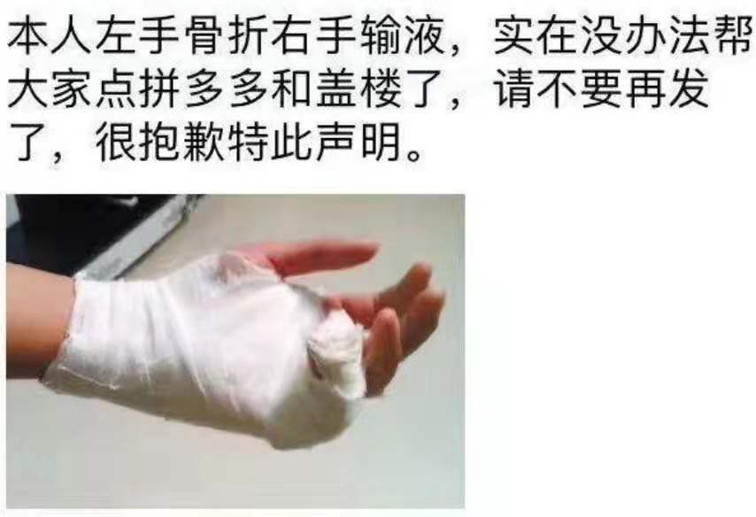 甚至还有朋友圈的段子这样说:“本人左手骨折右手输液,是在没办法帮大家点拼多多和盖楼了,请不要再发了,很抱歉特此声明。”