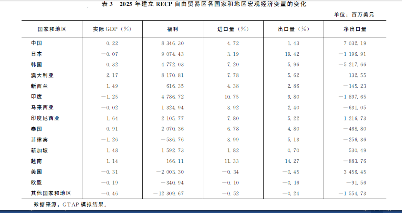 中国农业科学院农业经济与发展研究所助理研究员蔡鸿毅两年前采用美国普渡大学的GTAP(Global Trade Analysis Project)模型,分析了RCEP对中国、日本、韩国、澳大利亚、新西兰、印度、马来西亚、泰国、菲律宾、新加坡、越南等RCEP成员国以及美国和欧盟的影响。该分析假设RCEP于2025年完全建立,自贸区内所有产品实现零关税,所有农产品关税配额取消,不存在贸易壁垒及其他非关税贸易壁垒。