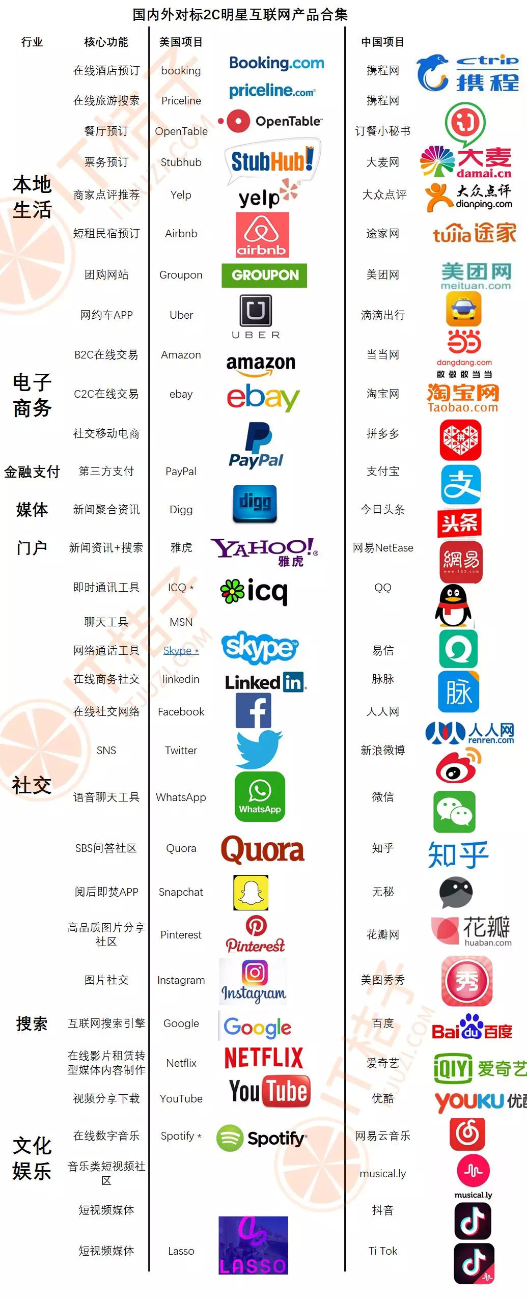 不得不说,这种变化与互联网的开放性息息相关:互联网从诞生之日起就是跨越国界的。国内像李彦宏这样的第一批互联网大佬们多是海归,学习美国硅谷的新模式、新技术、新产品成为必经之路;为此 IT 桔子整理了近 20 年国内外涌现的明星互联网对标公司,发现了一个有趣的现象——