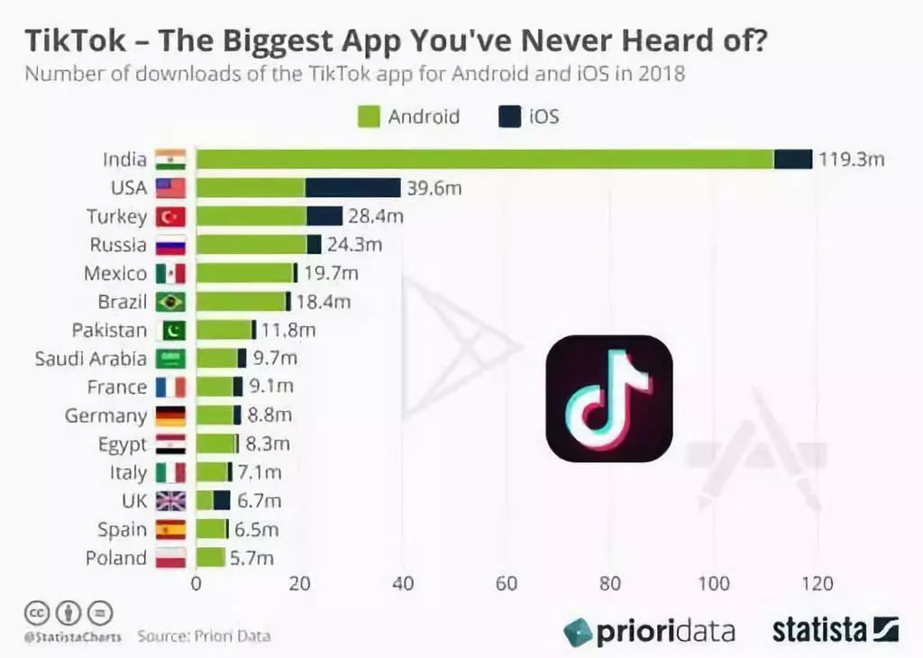 仅一年半时间,TikTok 已覆盖 150 个国家和地区,涵盖 75 种语言,全球月活跃用户已超过 7 亿,其中在印度拥有 2 亿用户。相比之下,Facebook 目前在印度有 3 亿用户,但 TikTok 在下载量上已经超越 Facebook。