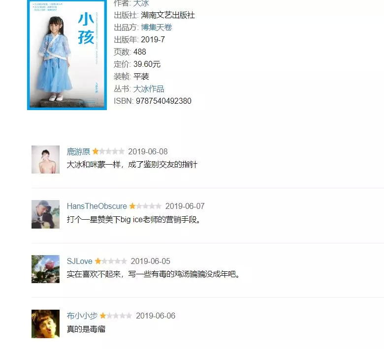 大冰新书《小孩》发布还未满三个月,书评区已经沦为一星评论大型灾难现场。