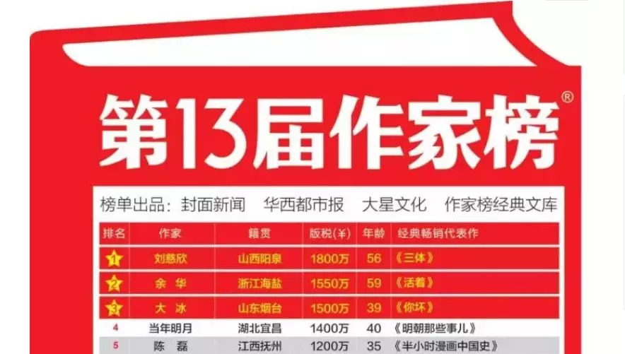 从2016年开始,大冰以1800万的版税空降第10届中国作家富豪榜第五位,往后连续4年都进入到作家富豪榜前五。