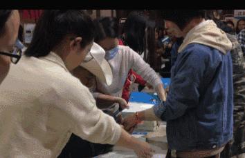 递书、翻书的动作全权由工作人员完成,大冰右手签字,左手保持着固定的姿势,等着粉丝来握。