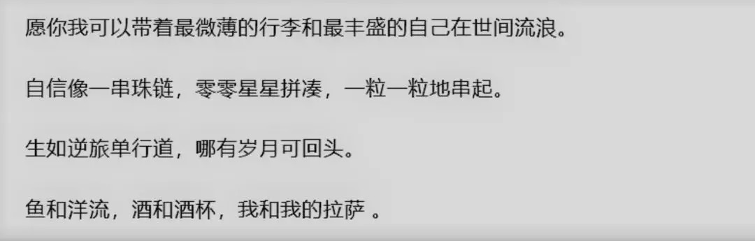 理想、流浪、姑娘、岁月、酒、故事、远方... 随机排列组合,就熬出了鸡汤。