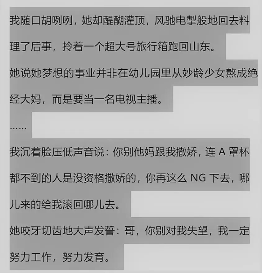 但如果这个姑娘是颜值普通、还平胸,大冰就完全换了一张面孔,在他的理论里: