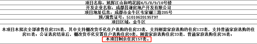成都房协官网显示,该项目本批次推出226套房源,吸引了138人参与摇号,中签率100%,最终选房结果则为售出69套(棚改0套,刚需33套,普通36套),剩余157套,成交率仅30.5%。