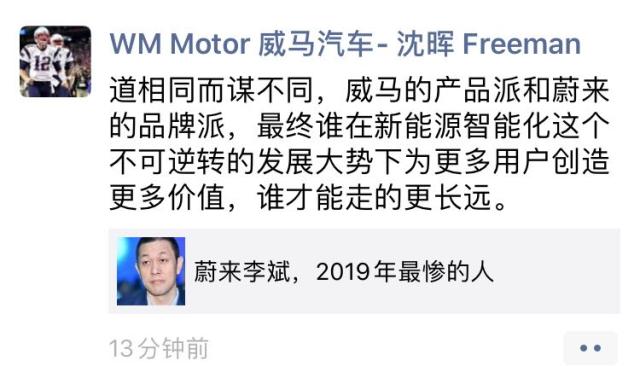 而威马汽车创始人沈晖的态度就多少显得有些直白,他在朋友圈将蔚来定义为品牌派,将威马划归为产品派。