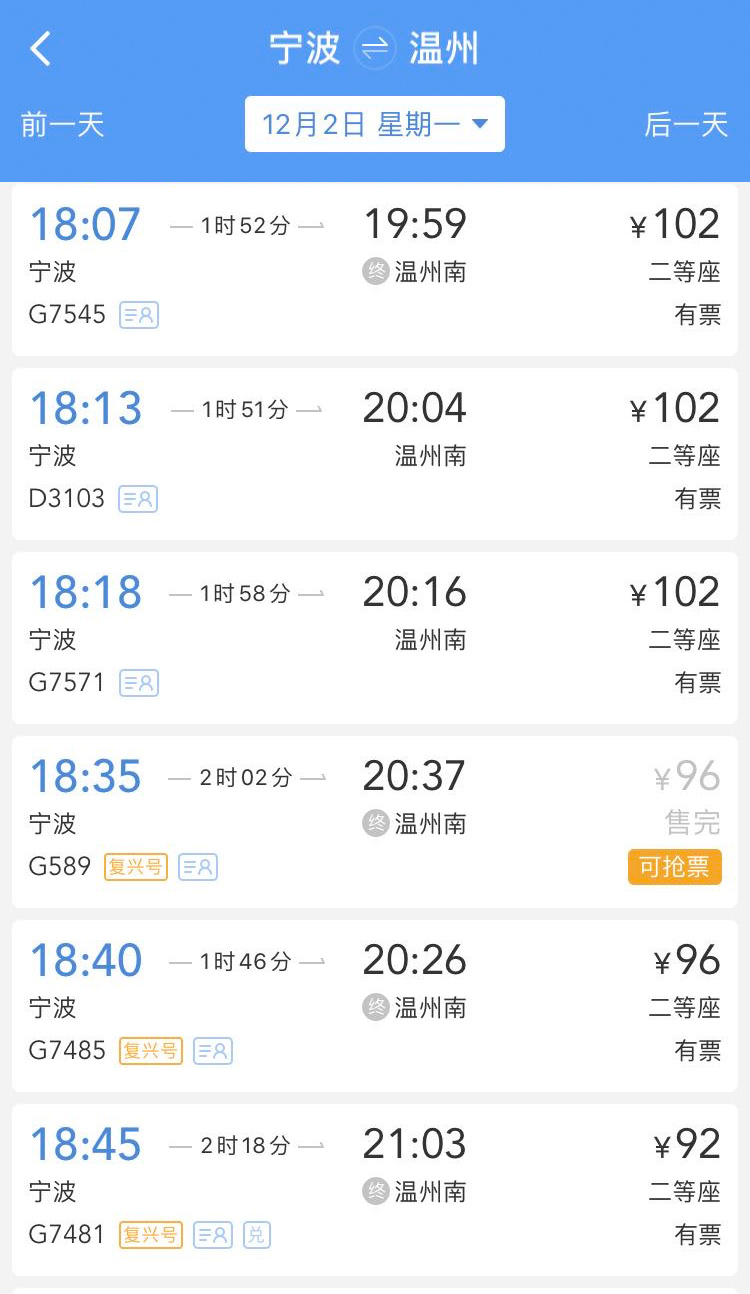 比如宁波到温州南的高铁列车,在12月1日前票价均为96元;从12月起,两地之间的高铁票价根据车次出现差别,从92元到102元不等。