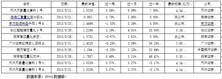 注:渤海汇富量化宝分级B、申万宏源共盈中冠1号B、招商智远量化多空均为今年以来新成立产品,因此无近一年收益率。天风天象量化套利1号B和C产品均为天风天象量化套利1号的劣后级资金,优先级和劣后级份额之和比例不超过4:1。