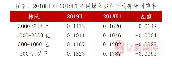 2019年上半年,上榜的百家房企平均存货周转率0.124,2018年同期该100家房企的平均存货周转率为0.131,整体平均存货周转率略降。