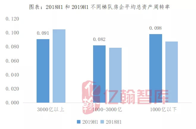 最后,1000-3000亿房企的总资产周转率为0.082,其实与3000亿以上房企的总资产周转率相差无几,而且该梯队房企的平均总资产周转率较2018年同期有所提升,拉升了整个行业的平均总资产周转率。