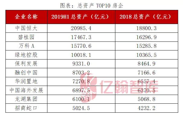 2019年上半年,总资产超过3000亿的房企有18家,较2018年末新进4家,分别为华侨城A、金地集团、旭辉控股和绿城中国,总资产分别为3346.0亿元、3108.5亿元、3020.4亿元和3001.7亿元,较2018年末分别增长13.7%、11.7%、25.3%和7.3%。