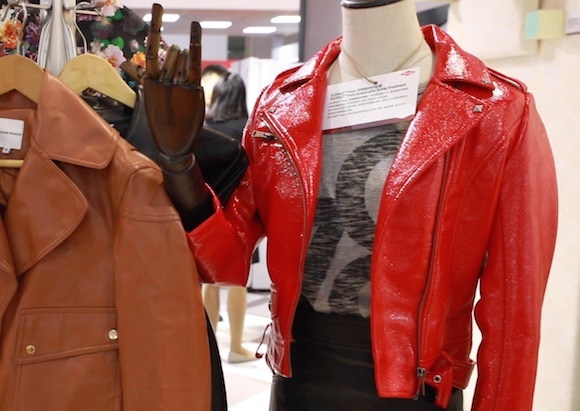 陶氏化学的展台一角,四件人造革服装摆放在衣架上。这是该公司在中国首发的水性聚氨酯产品,被应用于这些人造革产品的生产过程中。