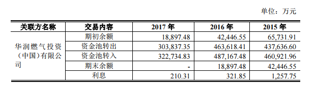 即使在资金层面,成都燃气与华润燃投也存在名目繁多的巨额关联交易。招股书显示,2011年8月,成都燃气加入华润燃投设立的华润燃气资金池。2015年-2017年,成都燃气每年三、四十亿资金进出华润燃气投资资金池,直到2017年9月底才退出。值得注意的是,这期间成都燃气获得的收益率分别为2.33%、1.20%、2.23%。而同时期内,成都燃气的全资子公司成都液化天然气有限公司,向关联方提供借款的年利率在8.27%-8.3%之间,远高于华润燃气资金池的收益。