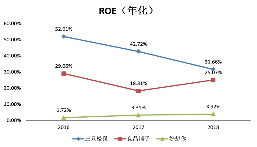 高周转率也给三只松鼠带来了高收益率。数据显示,2018年,净资产收益率高达31.66%。同期,竞争对手良品铺子和好想你的年化ROE分别只有25.07%和3.92%。