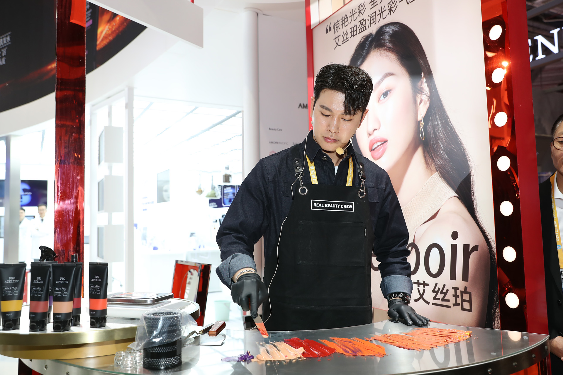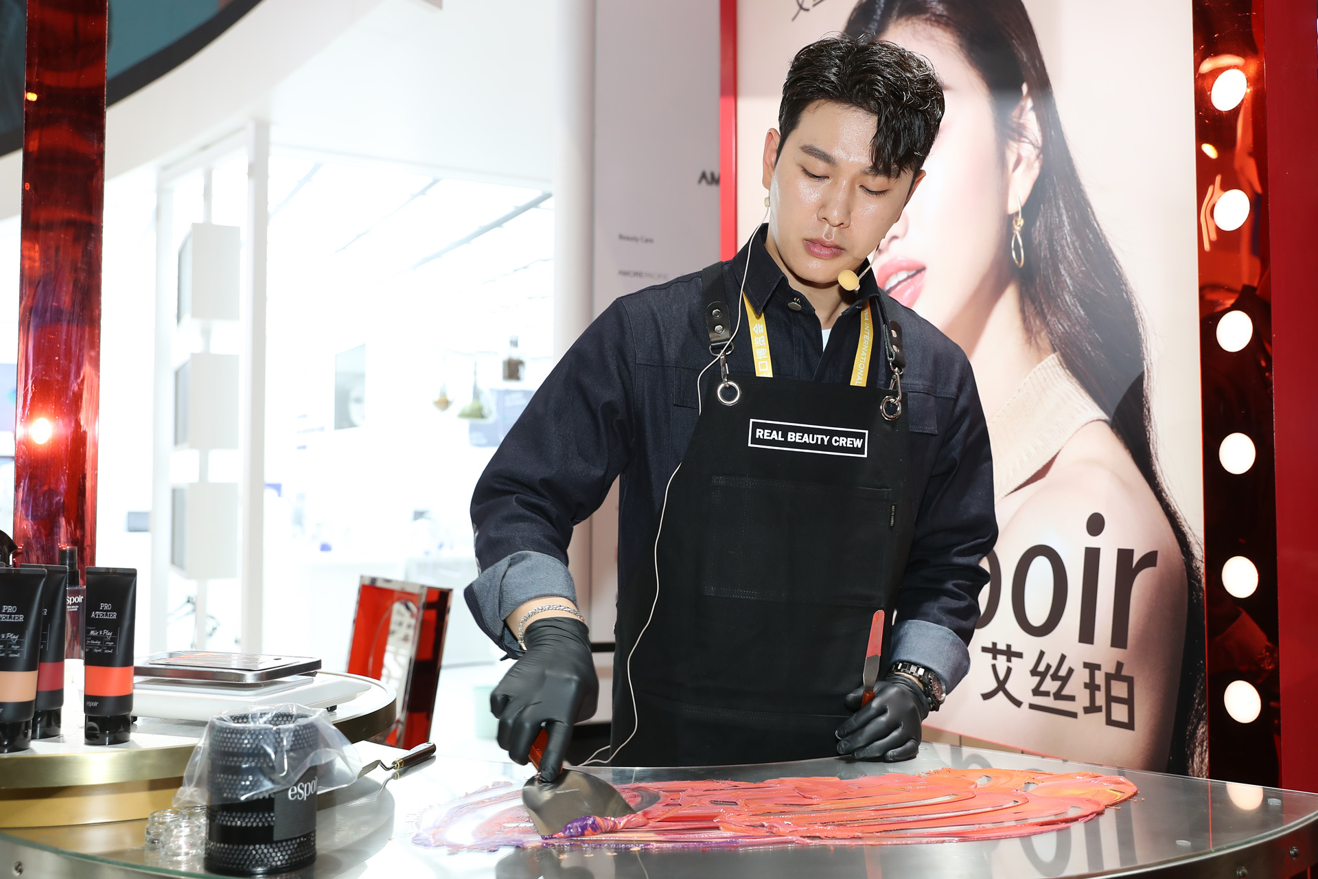 虽然espoir如今还未进入中国,但今下午的它算是吸引了一波眼球。在espoir的展位上,它找来韩国美妆师现场为观众调配了一款口红,色号是时下最流行的“干玫瑰色”。不过,这款口红是用锅铲“炒”出来的。美妆师先将七八种颜料以次铺开,再用铲子将它们炒在一起,最后加入粉末。