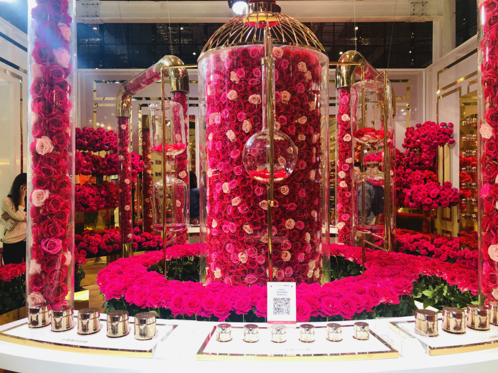 在品质生活馆二层的欧莱雅展位内,兰蔻的玫红色花海引来了不少参观者围观,但这些花朵颜色鲜亮、花朵较大,看起来亦真亦假。事实上,在展区中心的玻璃器皿中的玫瑰是假的,但是周围其它的玫瑰花都是真花。