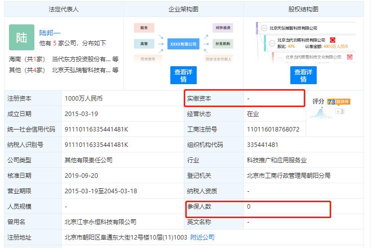 天眼查信息显示,天弘瑞智成立于2015年3月19日,曾用名北京江宇永恒科技有限公司,目前的注册资本为1000万元,但尚无实缴资本信息。在2018年11月变更工商信息前,天弘瑞智的注册资本仅10万元。长期以来,天弘瑞智更像是一个空壳。据工商信息,天弘瑞智的2018年度报告显示,该公司的社保缴纳人数为0。