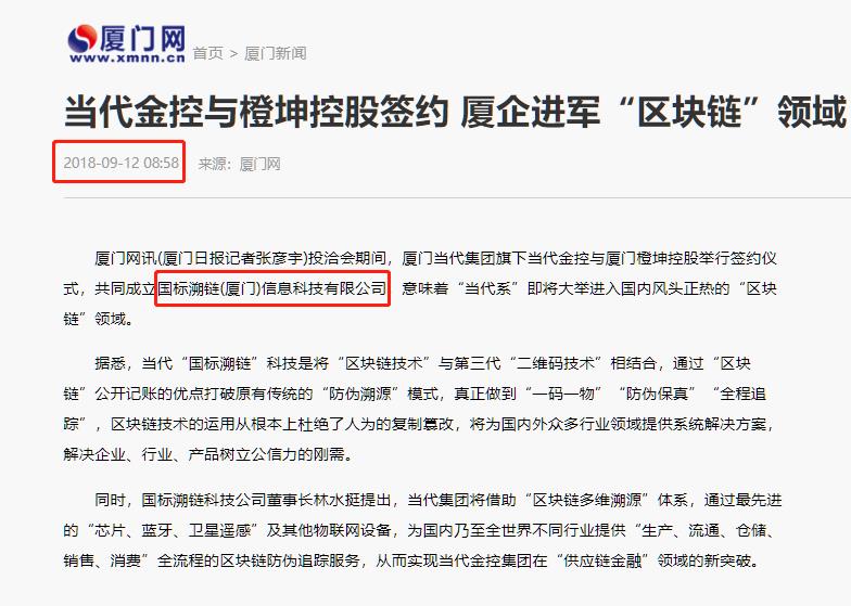 资料显示,上述消息援引自厦门网2018年9月12日的一篇报道。除上述信息外,该报道还称,“国标溯链科技公司董事长林水挺提出,当代集团将借助区块链多维溯源体系,通过最先进的芯片、蓝牙、卫星遥感及其他物联网设备,为国内乃至全世界不同行业提供生产、流通、仓储、销售、消费全流程的区块链防伪追踪服务,从而实现当代金控集团在‘供应链金融’领域的新突破。”