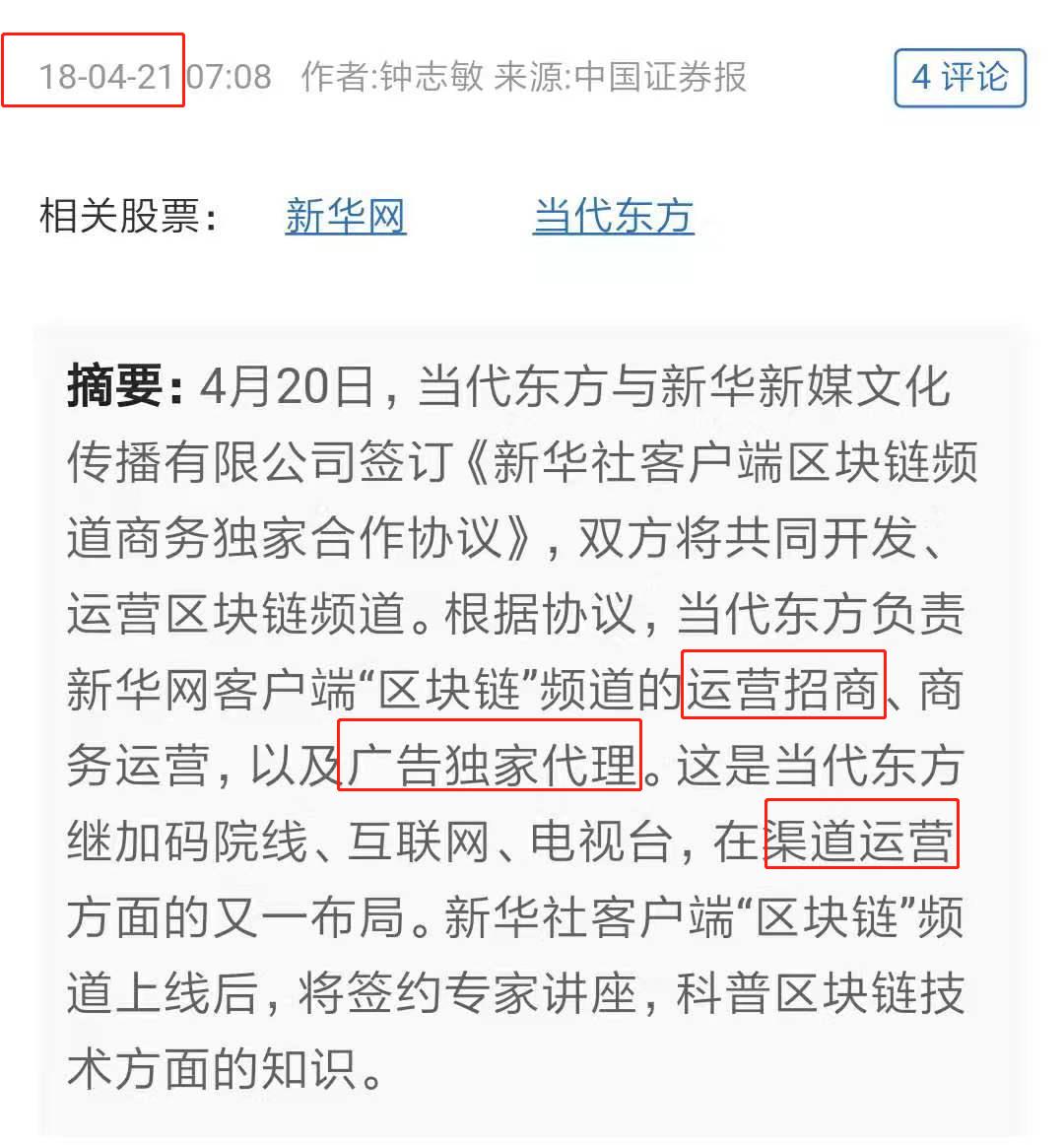 据公开资料显示,2018年4月20日,当代东方与新华新媒文化传播有限公司签订《新华社客户端区块链频道商务独家合作协议》,双方将共同开发、运营区块链频道。