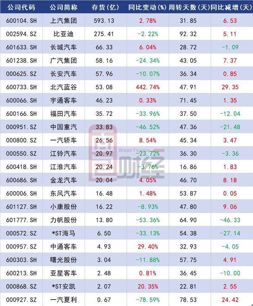 从单家车企存货增减变动来看,截至2019年三季末存货同比增长的车企有10家,环比中报增长的有10家。其中,同比及环比增长最多的车企均为北汽蓝谷,其存货同比增幅约442.74%,环比二季末增幅约71.45%。