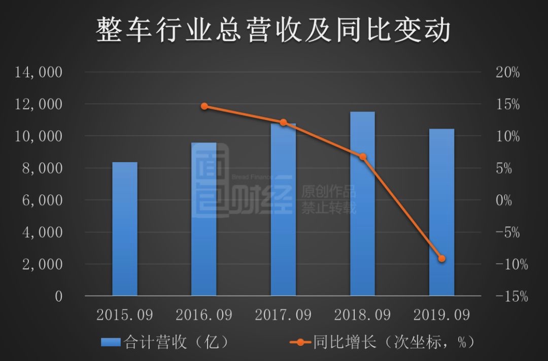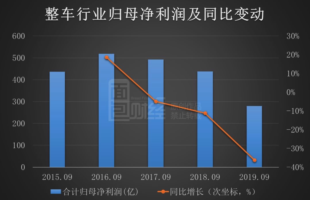 由图可知截至2018年9月,整车行业总营收虽增速下行,但整体规模保持增长。而到了2019年9月,行业营收增速大幅下降逾15个百分点,同比由正转负。