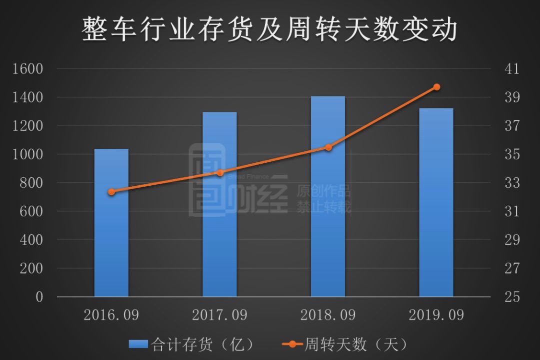从上图来看,行业三季末的存货总规模在经历了数年的持续增长后,于2019年出现回落。这或许反映出车企去库存取得一定效果。需要留意的是,行业的存货周转天数继续上行,周转率进一步下降。自2016年三季度至2019年三季度,整车行业的存货周转天数由约33天延长至约40天,增加约7天,周转率下降约1.54。