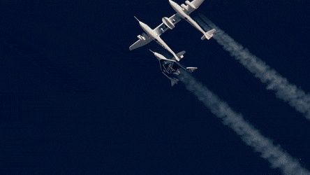 连体大飞机中间运载着一架小飞机,大飞机飞行到50000英尺高空释放小飞机,小飞机加速进入太空。
