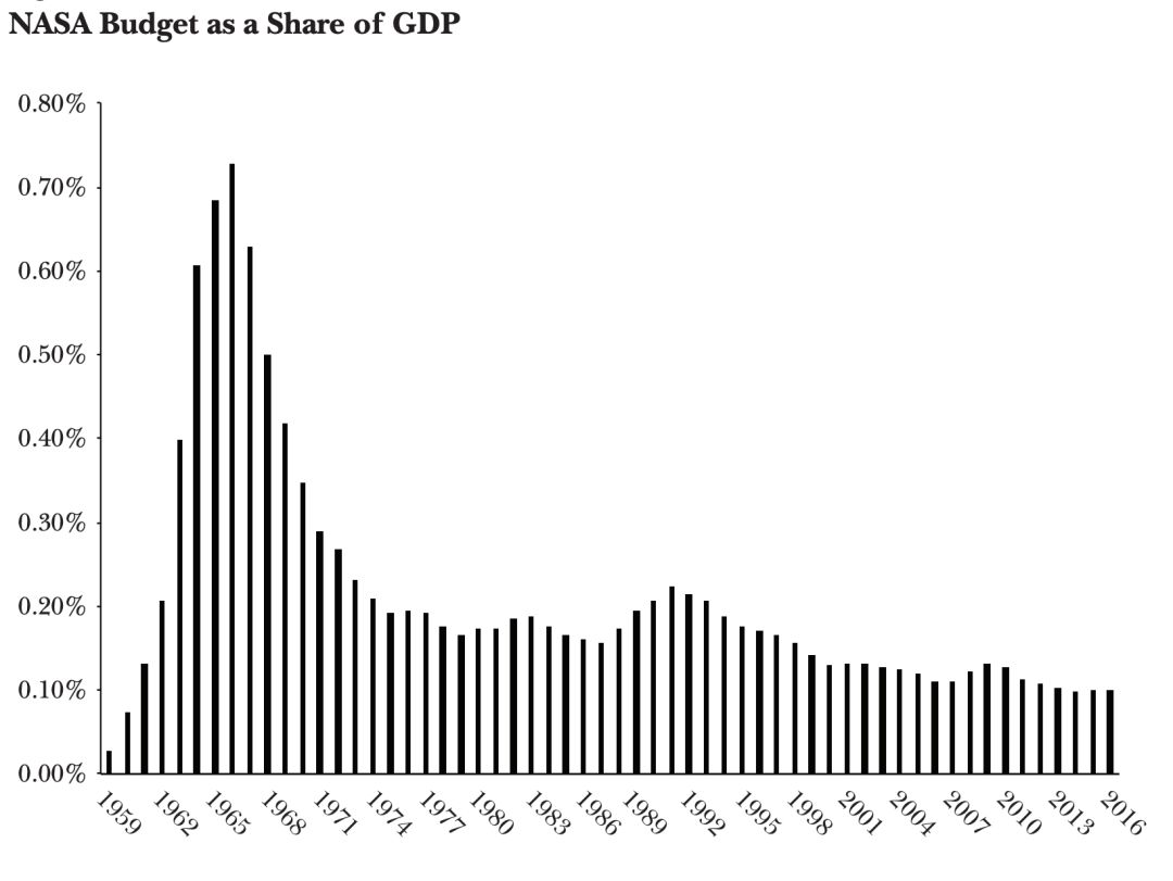 巨大的财政支出压力下,NASA自1960年代末期开始削减支出,现在NASA经费只占GDP的0.1%左右。