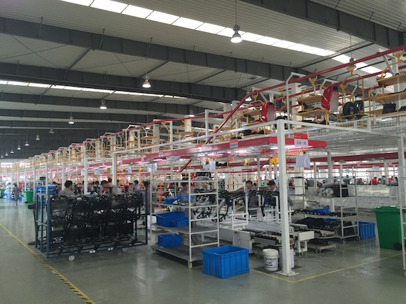 进入流水线后,最先拼装的是车架,之后是电气件,包括中控面板以及各种电线的安装,最后才会把外观的塑料壳装上。而在电气件安装和外观安装后还会各有一次检验程序,以提高良品率。