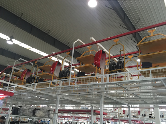 当200多个部件经过部装工人的组装变为了30多个大部件后,生产流水线就能正式派上用场了。所有的大部件会被摆在地面或悬挂式运输线上,方便流水线的工人拿取。