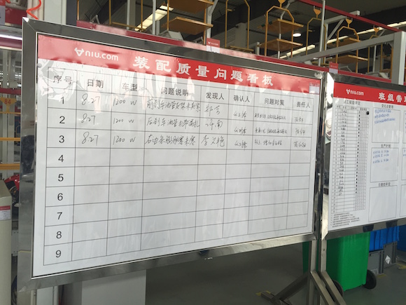 目前小牛官方透露的良品率为76%。据说,每天的生产任务结束后,管理人员和一线工人会一起开会总结当日工作,并讨论优化方案。而在小牛工厂的好几块区域都能看到下图中这块白板,请自行感受一下。