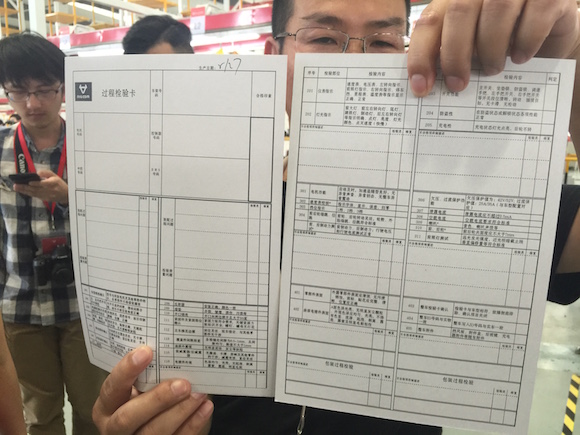 接下来在进入流水线时,每一辆车的安装过程都会被记录在一张“过程检验表”上。一车一张,就好像出生证明一样。