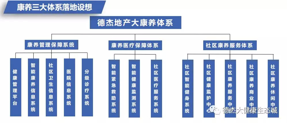 将德杰地产打造为中国康养地产的引导者,康养生活的倡导者是德杰集团大健康规划的落地设想。因此德杰集团以大康养体系规划布局:设立康养管理保障系统,为康养生活提供信息化支撑;设立康养医疗保障体系,依托黔中德尚国际医院,以医院为平台,建立一站式康养服务保障;设立社区康养服务体系,借助绿色智能管理体系、康养医疗保障体系,打造安心、舒心、养心的康养生活;